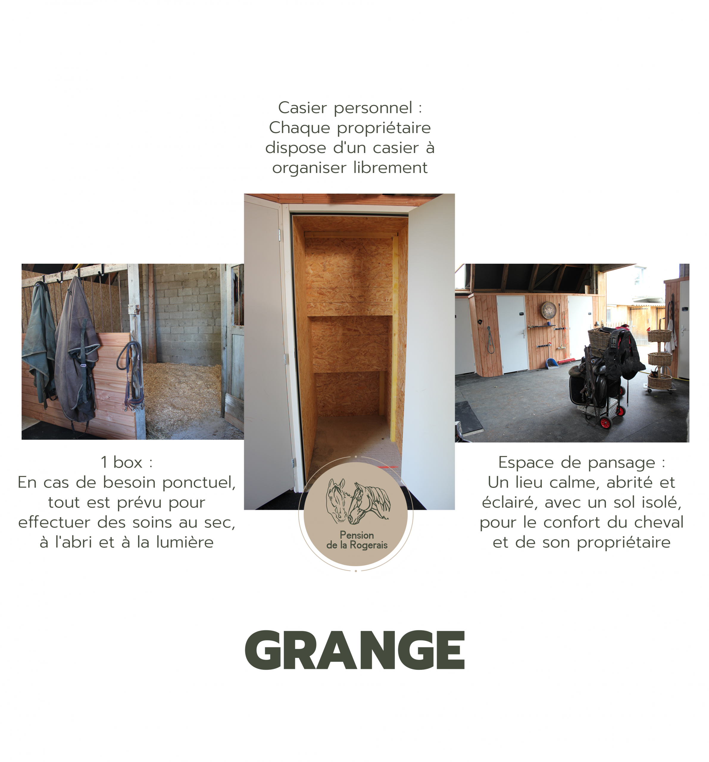 Abris pour hĂ©berger 2 groupes de 4 chevaux vivant ensemble Ă l’annĂ©e – Distributeur de foin Ă volontĂ© – Site avec clĂ´tures sĂ©curisĂ©es – Abreuvoir automatique – Carrière en sable 25X55 – Accès direct aux chemins de balade – Grange Ă©quipĂ©e : casier, box, espace de pansage – Chemin de dĂ©tente autour des près (plus d’1km) – Espace de pansage extĂ©rieur – Zone de roulade en sable – Digicode portail et grange – Parking pour voitures – Éclairage extĂ©rieur – WC